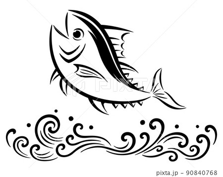 筆調のマグロと和風の波のイラスト