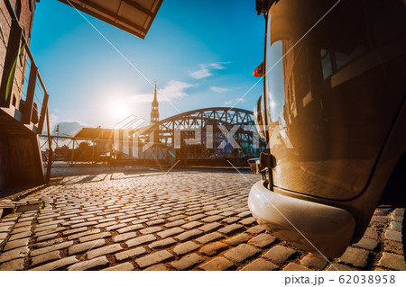 Close-up detail of retro style car on the cobbled square. Arch bridge over canals with Sankt Katherine church in the background. Speicherstadt of Hamburg. Warm sunset and blue sky