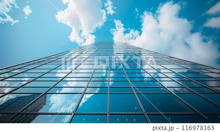 Architecture of modern skyscraper. Glass facade with blue sky reflection, sleek geometric structure,