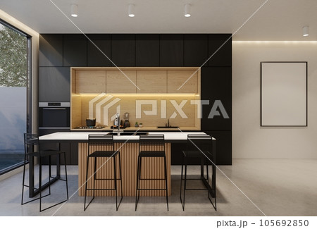 Minimal wooden kitchen and dining table. 3D illustration rendering
