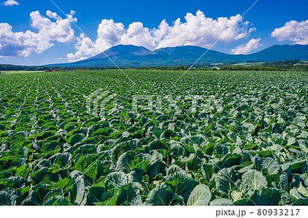 (群馬県)浅間山を背景に、嬬恋村のキャベツ畑