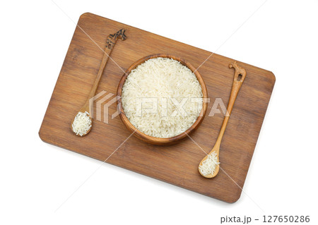 Raw white rice on wooden background. Long uncooked rice in wooden plate. Natural organic food. Traditional Asian cereal culture.