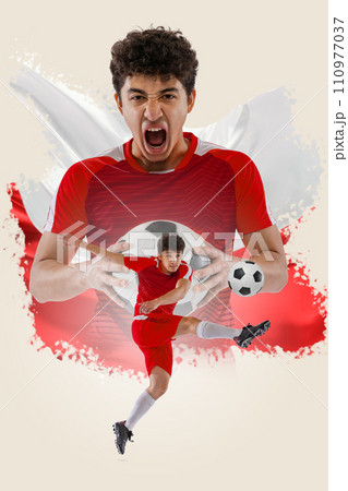 Emotional young man, soccer player representing team of Poland. Polish flag on background. Creative collage. Poster for sport events. Championship