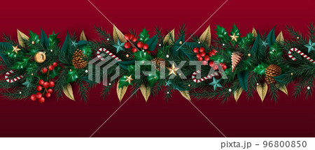 Merry christmas decorate holiday background. Garland border with forest berries and cones, golden toys, ornament frame, stars and fir, leaves and branches with xmas tinsel. Vector banner, exact poster