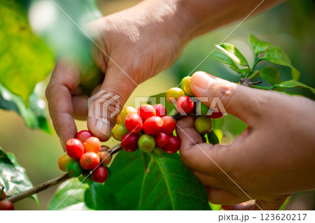 Close up hand harvest red ripe coffee seed robusta arabica berry harvesting coffee farm. Hand people harvest coffee bean ripe Red berries plant fresh seed coffee tree growth in green eco organic farm