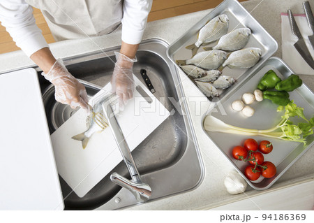 キッチンで魚を料理する日本人の主婦の手元、釣魚のヘダイを料理する