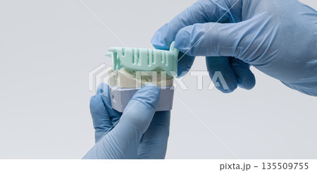 Dentist with tooth Anatomy model. Oral Teeth decay and disease, Scrape off tartar. March Oral health, Dentist Day, False Teeth. Toothache and Children Dental Health Month and Orthodontic Health Day