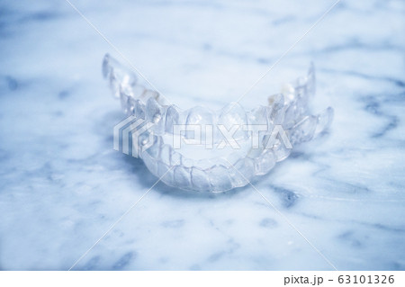 Extreme macro close-up of clear braces. Multiple aligners against a colored background, close-up with a shallow depth of field.