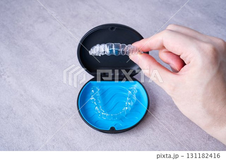 歯科矯正用のマスピースが入ったケースとアライナーを手に持っている画像