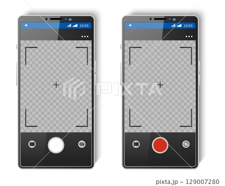 Smartphone screen with photo creation or video shooting. Camera buttons or focus grid. Transparent background. Realistic phone display. Mobile interface. Vector photography frames set