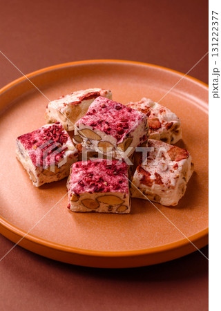 Nougat or white caramel with hazelnuts and strawberry pieces. White nougat