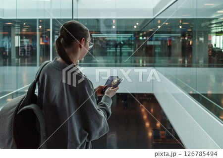 Young woman with a backpack holding a passport and smartphone while looking through glass at a contemporary airport. Concept of international travel, identity verification and global mobility.