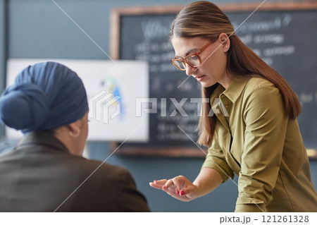 Medium shot of young female English language instructor explaining homework task to woman standing by students desk at end of lesson, copy space