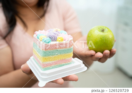 Calories counting and food control concept. woman using Calorie counter application on her smartphone with salad , vegetable, juice and croissant on dining table