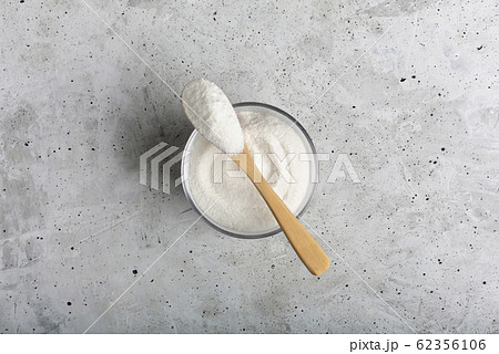 Collagen close-up on a beige background. Collagen protein powder in a white spoon. Natural supplement for beauty and health. Copy space, top view