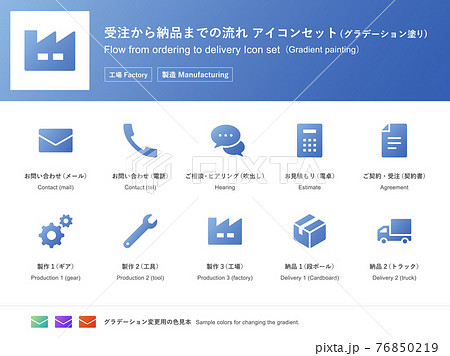 受注から納品までの流れ(工場・製造)のアイコン・イラストセット(グラデーション塗りバージョン)