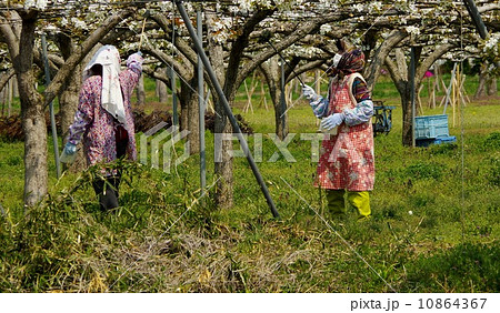 (長野県)果樹園農作業、向こうにアルプスの山並み