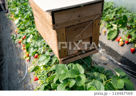 花粉交配用ミツバチの巣箱とイチゴ栽培