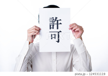 許可と書かれたパネルを掲げ気持ちを伝える人物