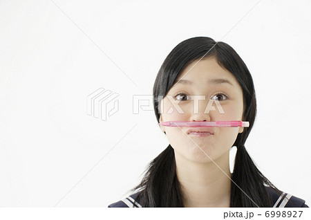 鼻の下にペンを挟む女子高校生
