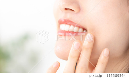 美しい白い歯をした若い女性の口元。美容、健康、スキンケア、清潔のイメージ素材