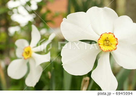 Close-up of white narcissus flowers (Narcissus poeticus) in spring garden