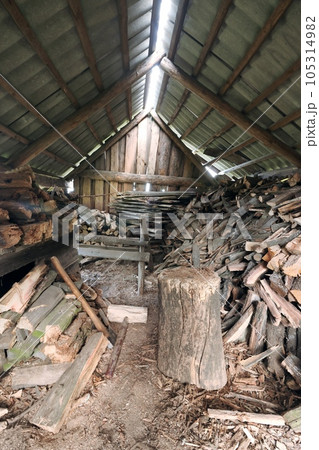 Chopped firewood in an old barn. Neatly folded. A deck for chopping firewood is visible.