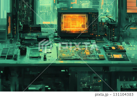 Futuristic retro computer setup with glowing orange screen displays intricate circuitry and technological details