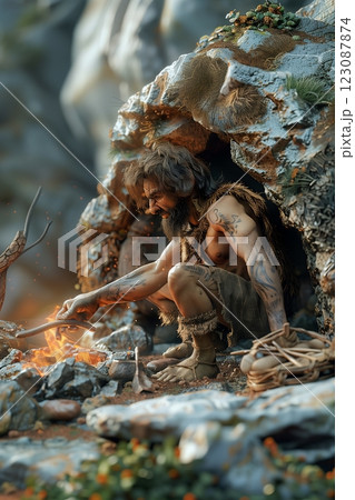 A prehistoric man tending to fire outside a cave, showcasing early human survival.