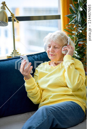 Charming elderly woman with gray hair choosing music on smartphone at home, have rest