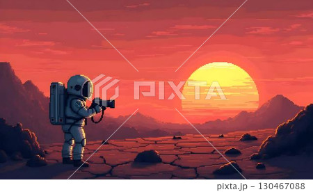 Pixel art of an astronaut capturing a sunset, with vibrant colors illuminating the sky in the background