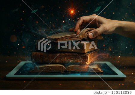 AI generated artwork of an old book glowing with magical energy above a tablet symbolizing the fusion of ancient wisdom and modern technology with sparks and mystical light