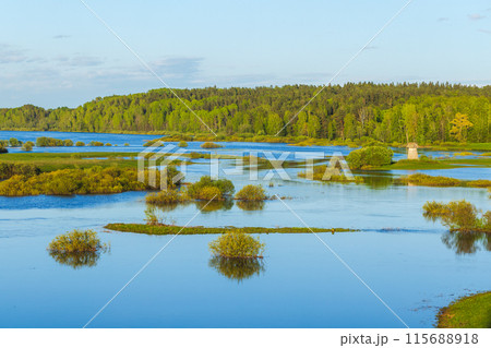 Rural summer landscape with old wooden windmill on the coast of Sorot river