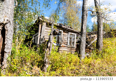 Abandoned destroyed rural wooden house in russian village in summer sunny day