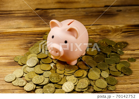 Pink piggy bank on a heap of coins on wooden background. Saving money concept