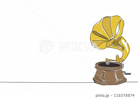 Single continuous line drawing gramophone. Classical music player using black discs. Technology from the past is now an antique. Retro. Vintage. Recording. Sound. One line design vector illustration