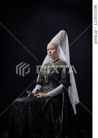 Portrait of young noblewoman in renaissance attire holding smartphone, gazing forward with composed expression against dark vintage background.