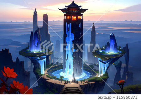 Fantasy landscape aerial view of a castle rising in a surreal cloud environment
