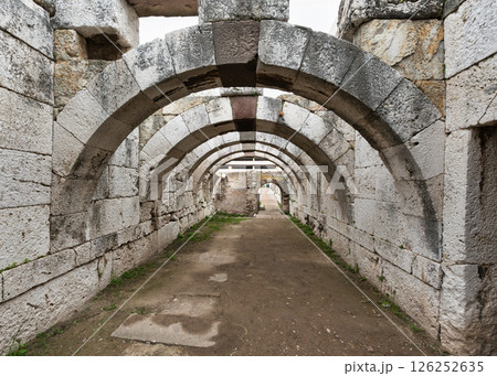 Exploring the ancient arches of Agora of Smyrna in Izmir, Turkey during sunset