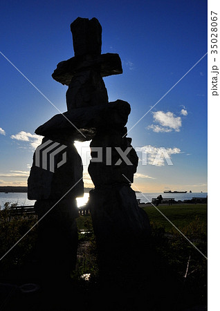 Inukshuk stone sculpture in the sunset time at English Bay Beach, Vancouver City beautiful landscape. British Columbia, Canada.
