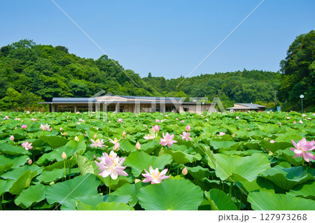 〈島根県)荒神谷史跡公園の大賀ハスの咲く風景