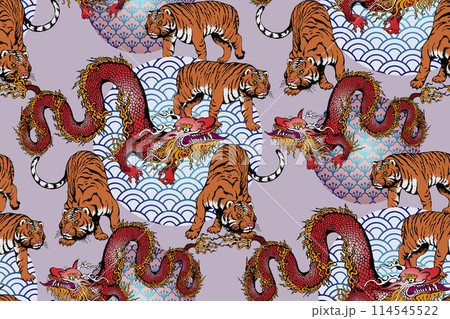 Dragons, tigers and pines. Seamless pattern with Chinese motifs. Suitable for fabric, wrapping paper and the like