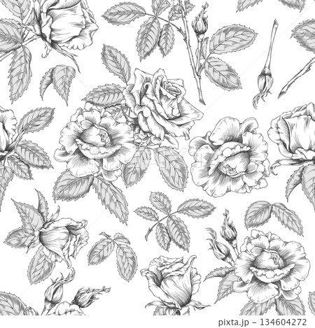 A seamless monochrome pattern with hand-sketched vintage roses, buds, and leaves.