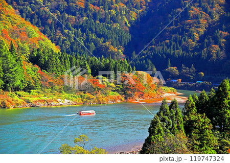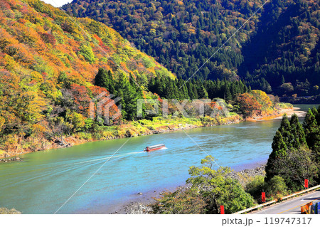 紅葉の中を進む最上川舟下り