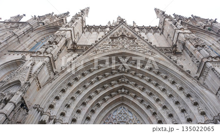 Detailed facade of the barcelona cathedral entrance, made on stone in gothic architectural style
