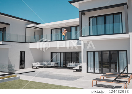 Property, house and senior couple on balcony enjoying sunny day in luxury family home. Retirement, real estate and rich elderly man and woman hugging, embrace and bonding in double story dream home