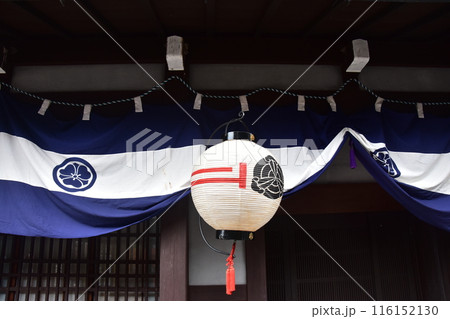 日本の岐阜県 高山市の古い町並み 春の高山祭期間中 古民家の前に飾られた提灯