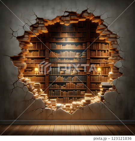 崩れた壁の奥に現れる秘密の書庫の幻想的な風景