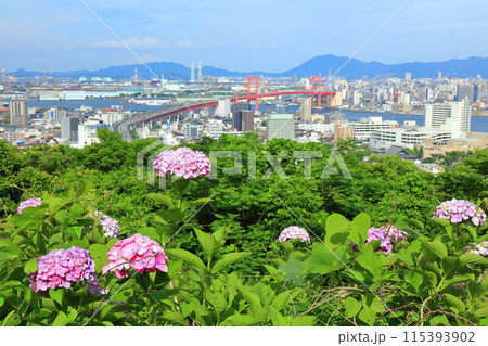 【福岡県】あじさい祭りの若戸大橋と北九州市街