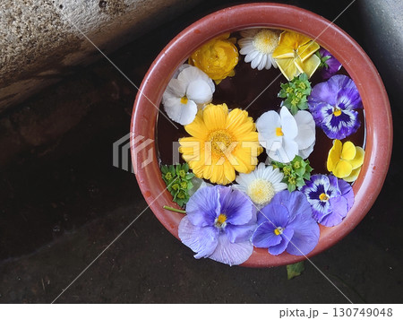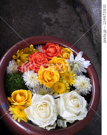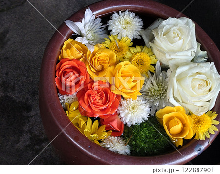 Colorful roses in a water basin 水鉢に敷き詰められた色とりどりのバラ